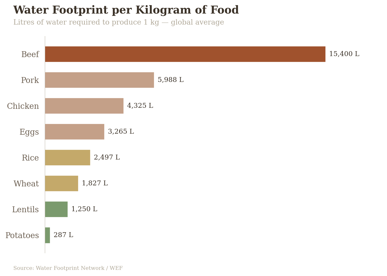 Consumers also have an important role to play: making more conscious choices would create advantages not only for the planet but also for our well-being. To give an example of the impact we can have: to produce just 1 kg of beef, on average 15,400 litres of water are required. In contrast, the same amount of land used to grow meat can produce five times more protein if used for cereals and ten times more if used for legumes.